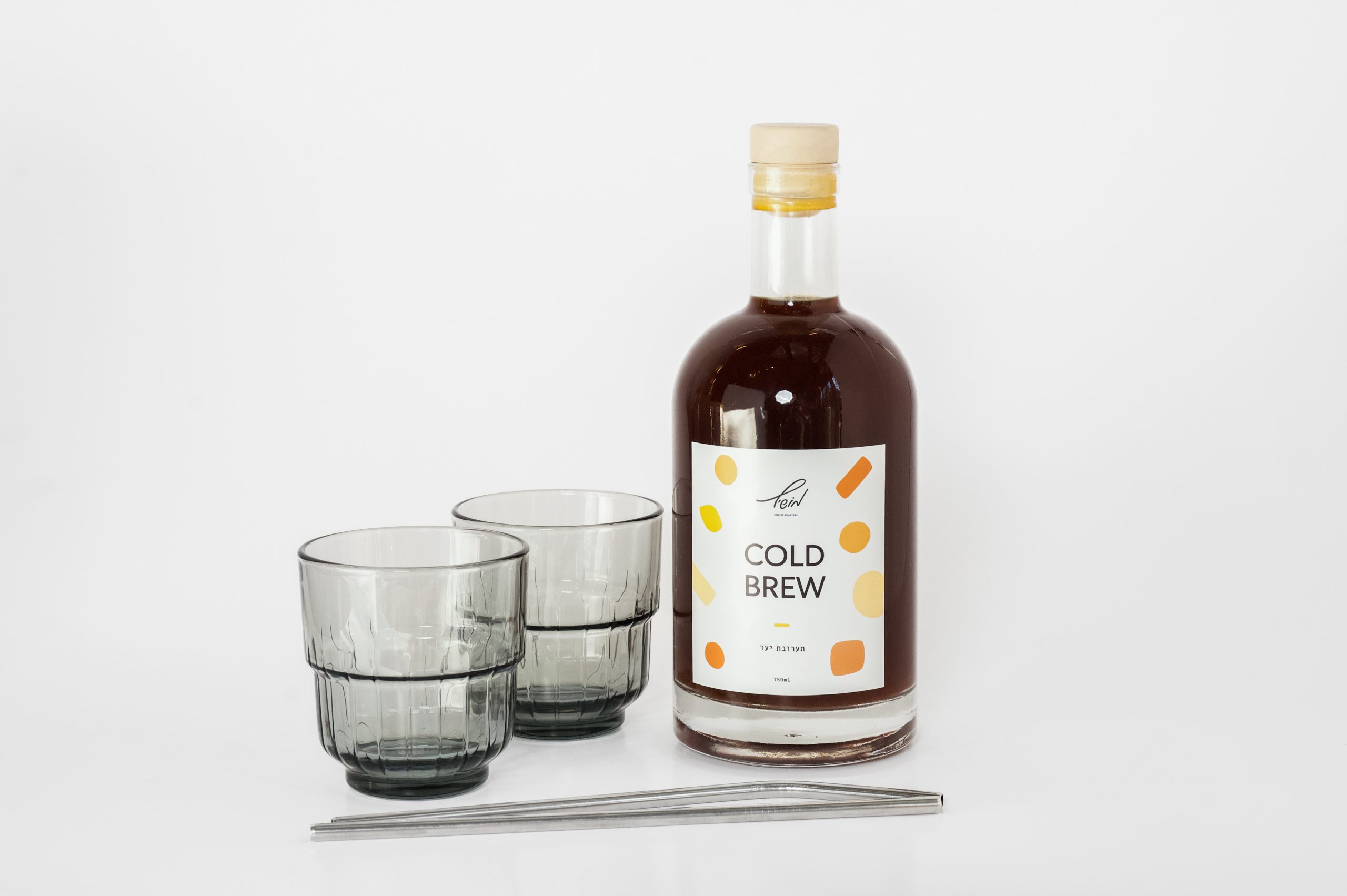 בקבוק קולד ברו, זוג כוסות זכוכית וקשים רב פעמיים.
